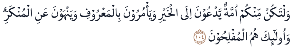 "Hendaklah ada di antara kamu segolongan orang yang menyeru kepada kebajikan, menyuruh (berbuat) yang makruf, dan mencegah dari yang mungkar. Mereka itulah orang-orang yang beruntung." (QS. Ali Imran: 104)